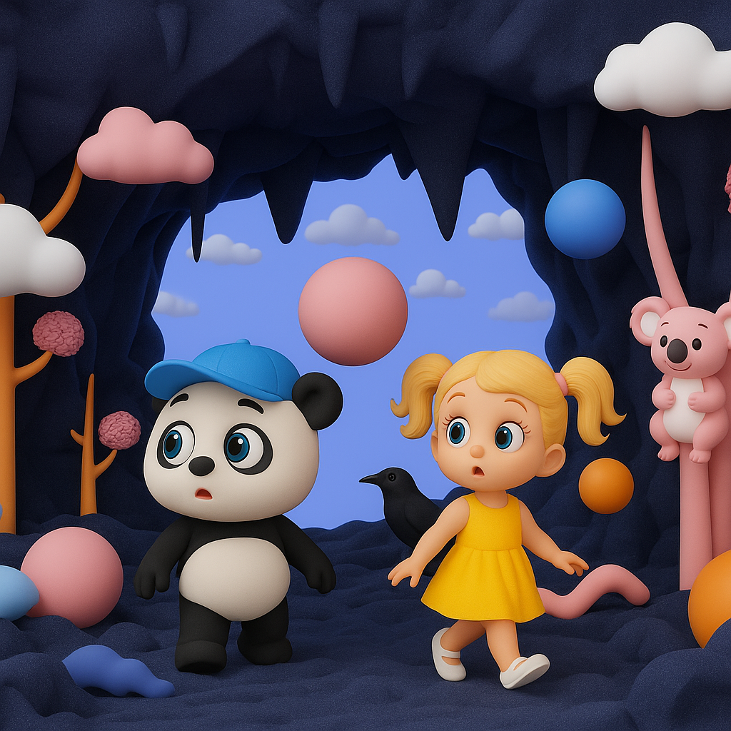 اقتربا من كرة زرقاء، وتقدّما إليها ببطء. وفي لحظة، أمسك باندا جانب الكرة، وأمسكت نايا الجانب الآخر. وفجأة ✨ بدأت الكرة تضيء بألوان جميلة وتضحك بصوت عالٍ: